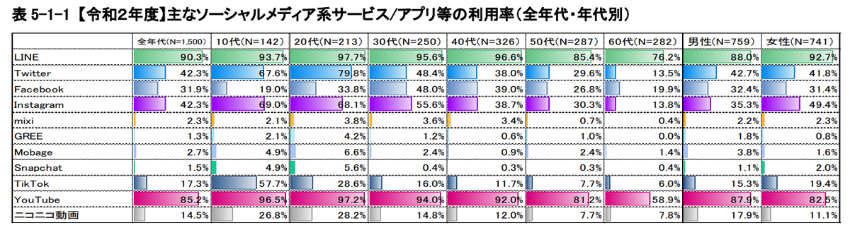 総務省が発表した令和2年度情報通信メディアの利用時間と情報行動に関する調査報告書によると、利用率がもっとも高いSNSは「LINE」で、90.3%となっています。最も低い60代でも70%を超える利用率で、世代を超えて利用者が多いことが見受けられます。